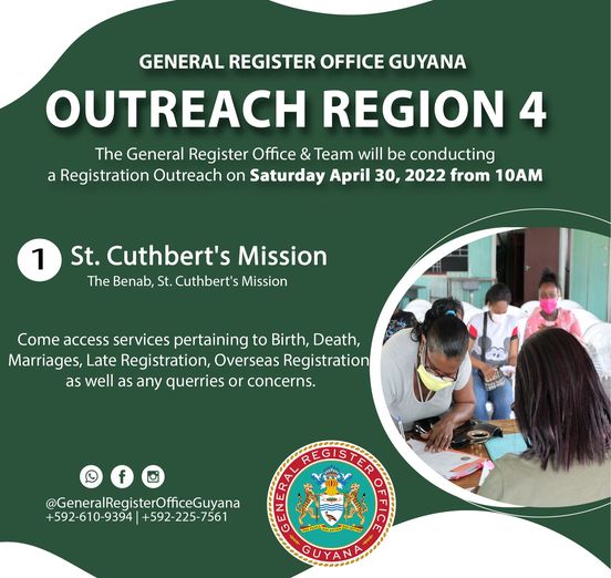 The General Register Office Guyana will be at St. Cuthbert’s Mission this Saturday from 10am. Be sure to visit to access services pertaining to Birth, Death, Marriage, Overseas and late registration and other queries and concerns. For more information feel free to send us a message.